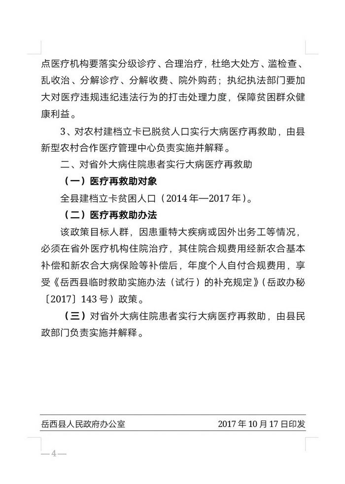关于印发岳西县贫困人口大病医疗再救助补充方案的通知