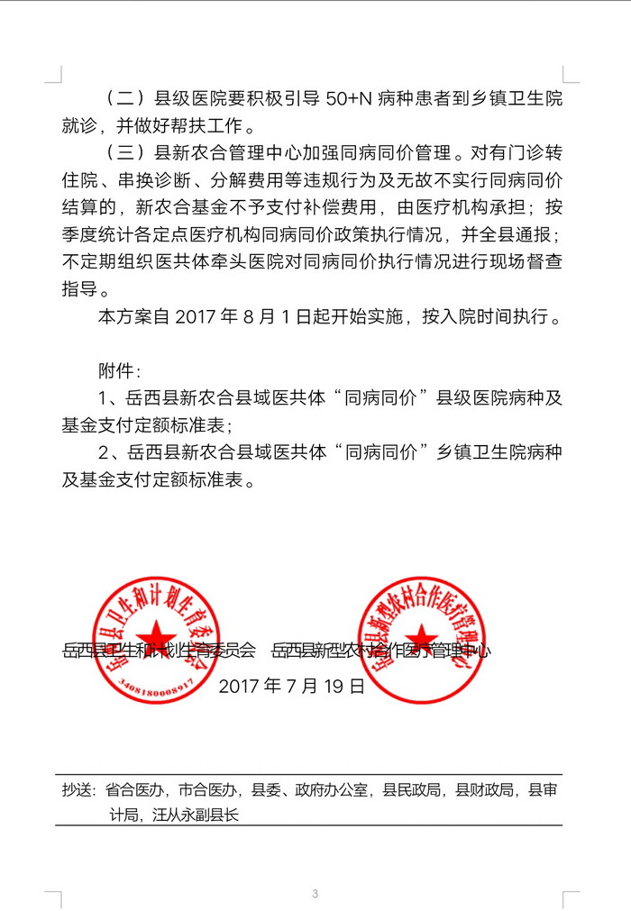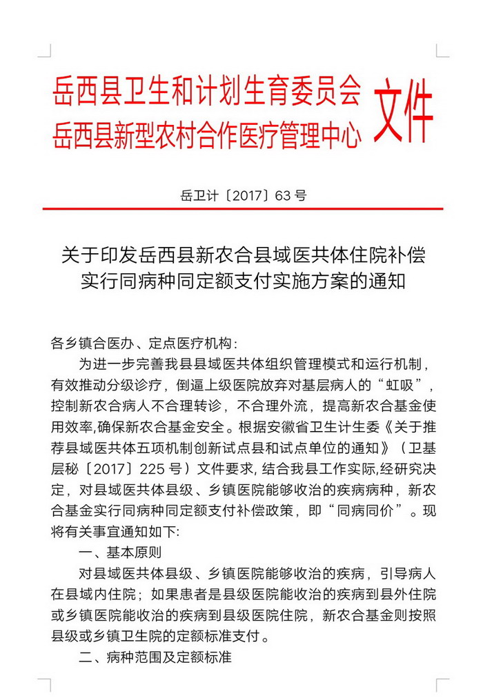 关于印发岳西县新农合县域医共体住院补偿实行同病种同定额支付实施方案的通知