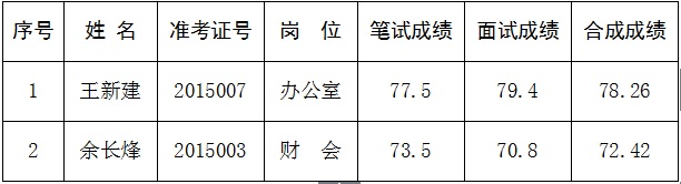 内容概述: 根据《关于从林业部门公开选调人员到枯井园保护区工作的公告》,经现场报名与资格审查、笔试、面试、体检和考察等程序,现将拟选调人员公示如下:序号姓 名准考证号岗 位笔试成绩面试成绩合成成绩1王新建20150