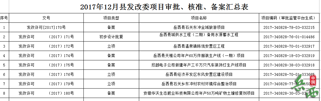 2017年12月县发改委项目审批、核准、备案汇总表