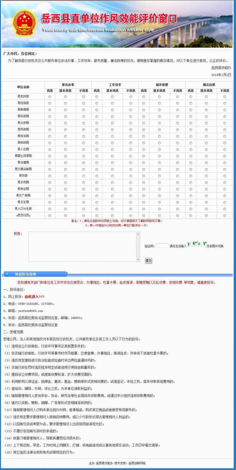 开展作风效能网络评价活动。在县政府政府网上设立评价窗口(网址:http://www.puke118.com/index.php?m=content&c=index&a=lists&catid=486)对县直行政机关及公共服务单位的作风效能情况进行评价。对评价结果,分月统计,每季度以适当方式进行通报;连续半年不满意率排在前三名的单位、部门将被给予告。