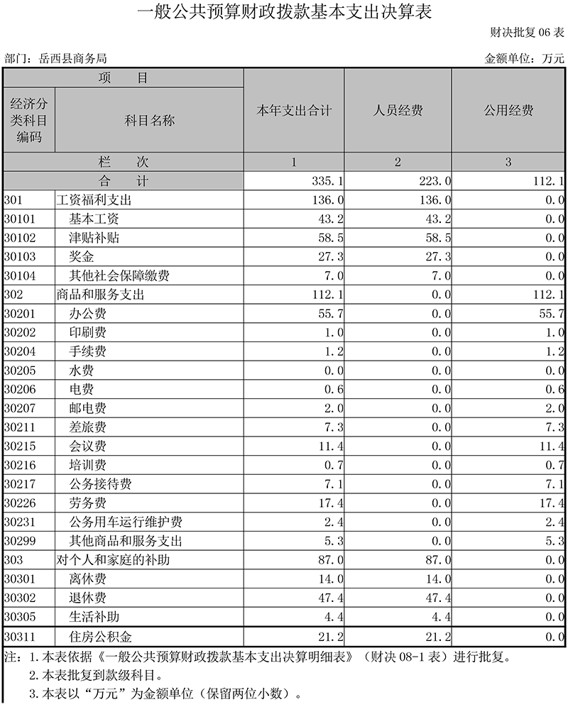 2016年度财政拨款基本支出335.12万元,其中人员经费223.02万元,主要包括:基本工资、津贴补贴、奖金、社会保障缴费、伙食补助费、绩效工资、其他工资福利支出、离休费、退休费、生活补助、住房公积金其他对个人和家庭补助支出;公用经费112.1万元,主要包括:办公费、印刷费、手续费、电费、邮电费、差旅费、会议费、培训费、公务接待费、劳务费、公务用车运行维护费、其他商品服务支出等。