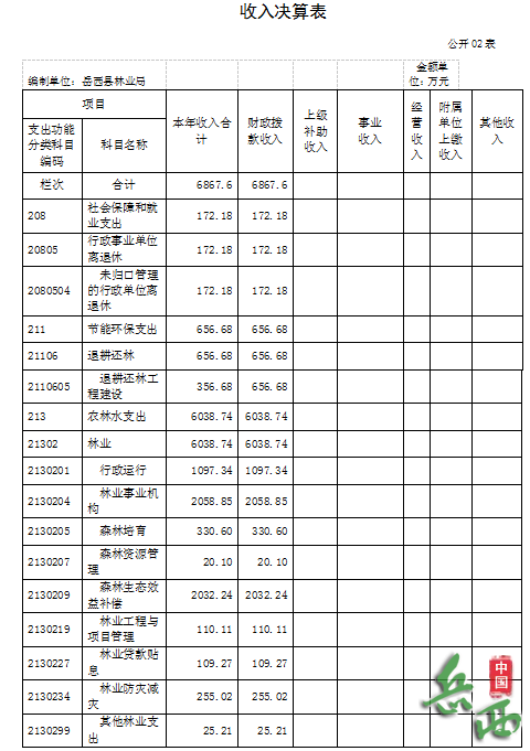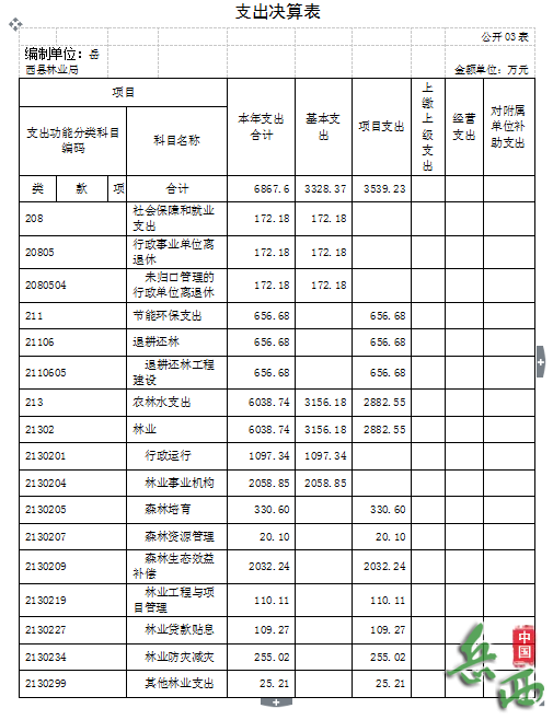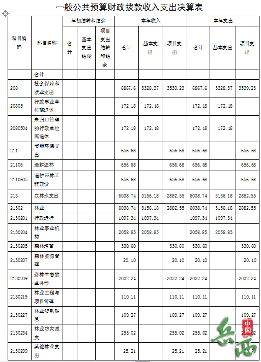 社会保障和就业支出172.18万元,节能环保支出656.68万元,农林水支出6038.74万元,其中:行政运行支出1097.34万元、林业事业机构支出2058.85万元,项目支出2882.55万元。